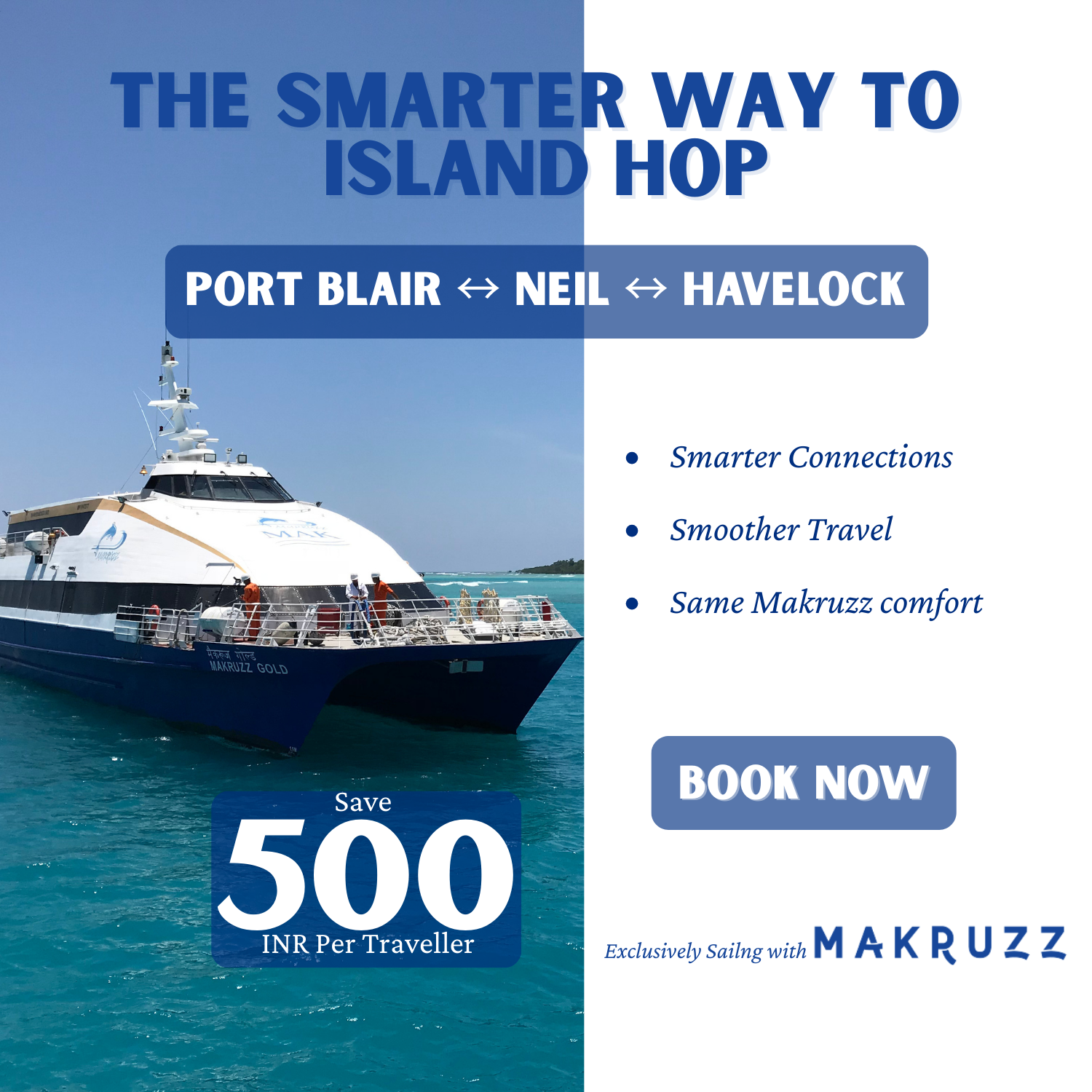 The Makruzz Experience : Pioneers in the industry, Makruzz, in existence since 2009, operates the largest network of high speed vessels in the Andamans with over 10 connections daily between Port Blair, Havelock and Neil Island. Our mission is to provide comfortable, timely, safe and reliable sea transportation for every traveler.